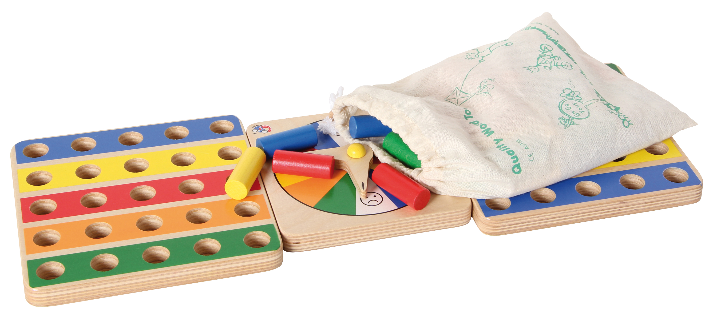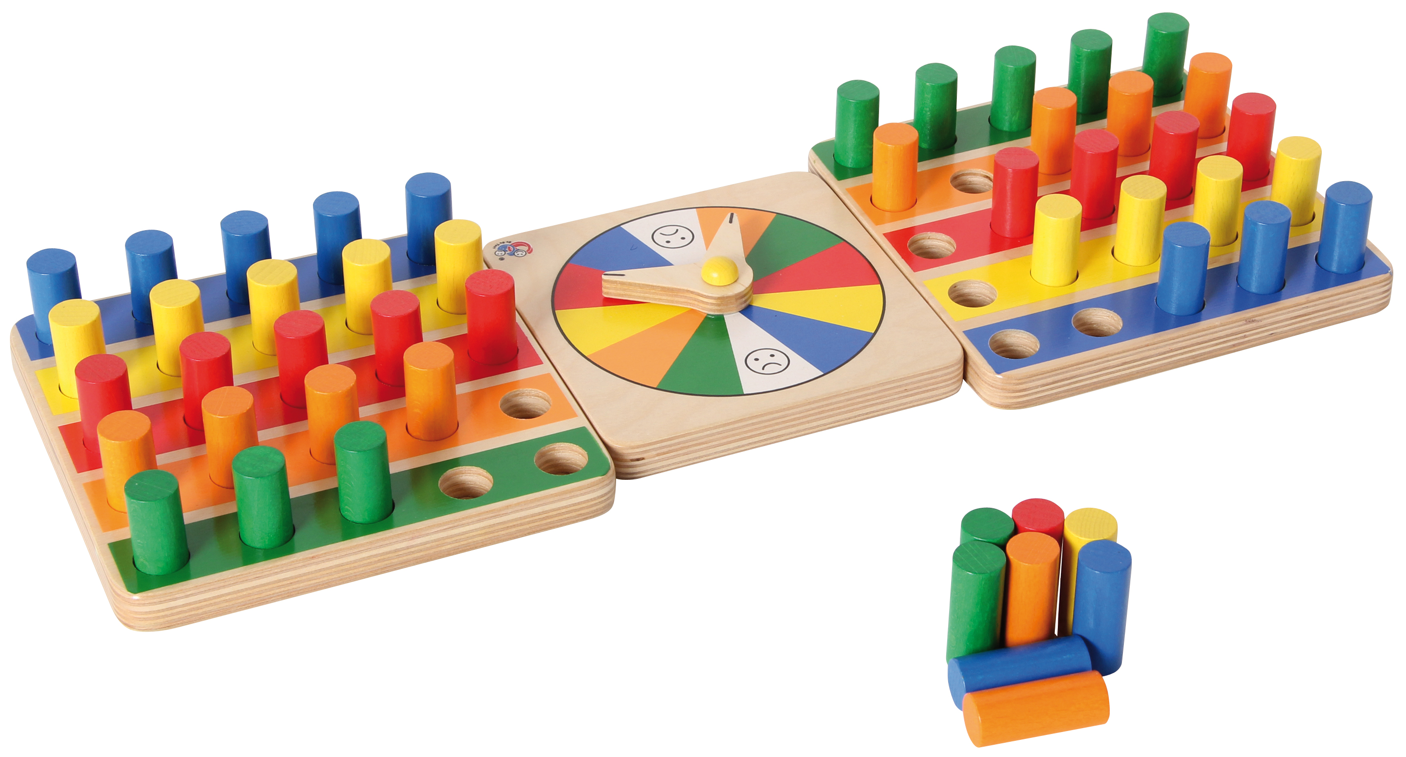 Tolles Familienspiel aus Holz für 1-2 Spieler oder Teams. Fördert spielerisch das Zählen und die Farbsortierfähigkeit der Kinder. Dreh den Zeiger auf dem Farb-Rad, suche die passenden farbigen Stecker und stecke sie in die zugehörigen Felder! Gewinner ist, wer zuerst alle seine Reihen gefüllt hat. Das Spiel fördert die räumliche Vorstellung und das logische Denken.
