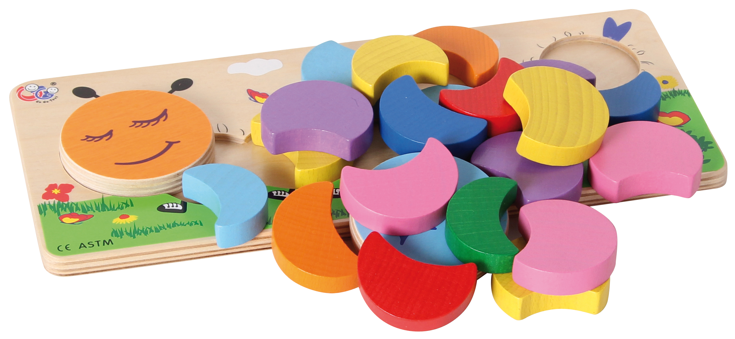Eine spannende Herausforderung für alle Kleinen. Die bunten Holzteile müssen entsprechend der Anordnung auf den Vorlagenkarten sortiert und in den Holzrahmen eingelegt werden.