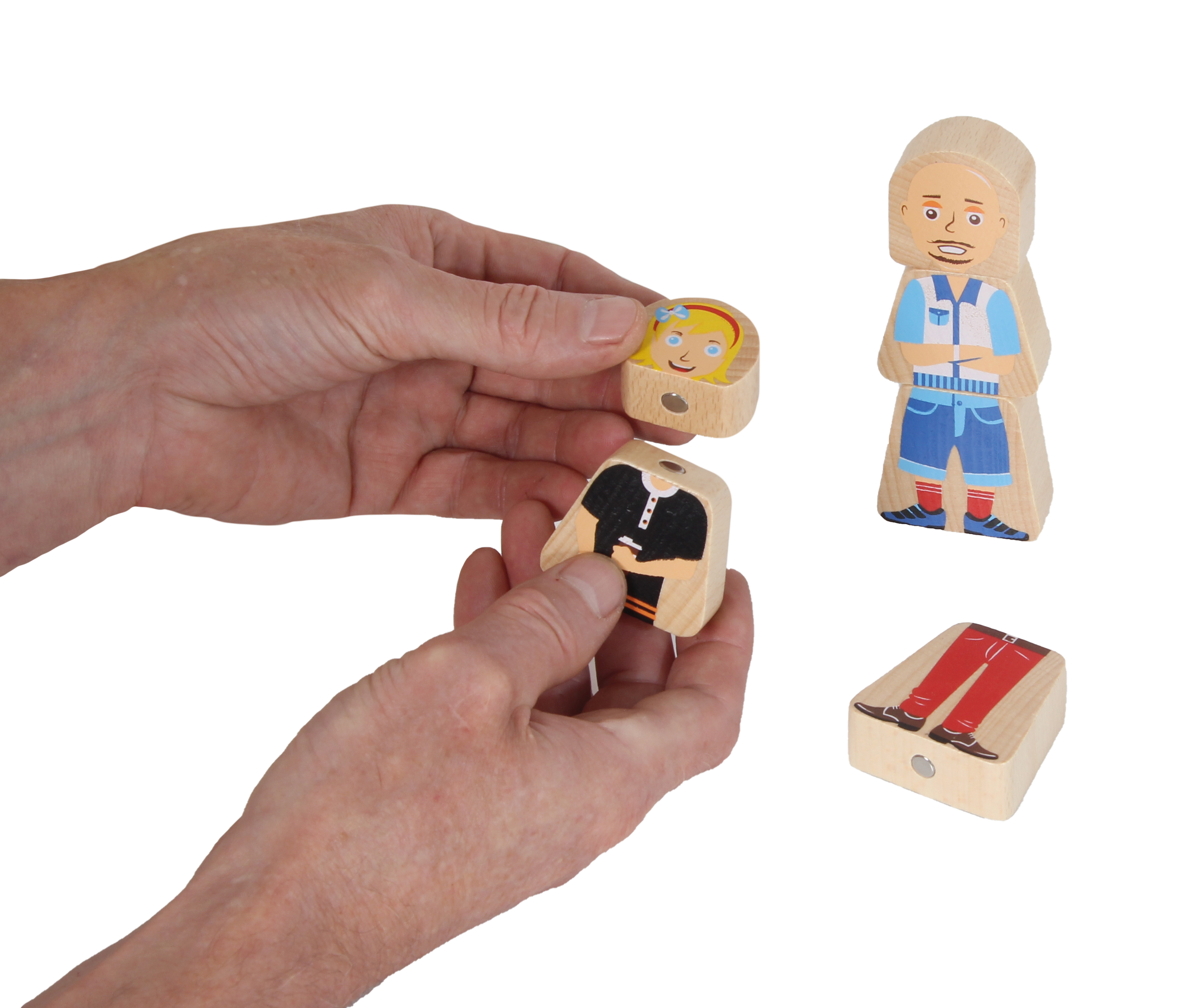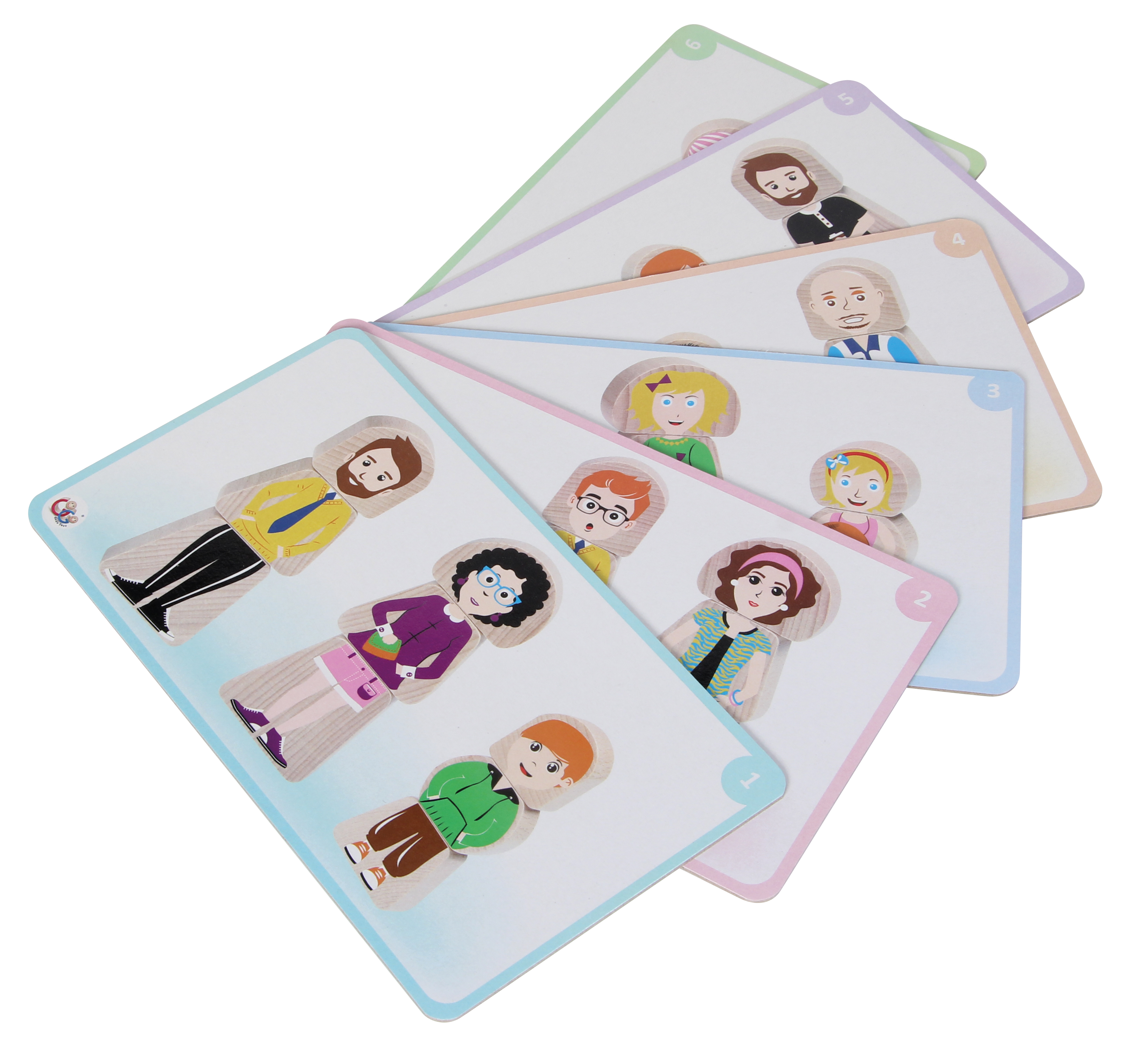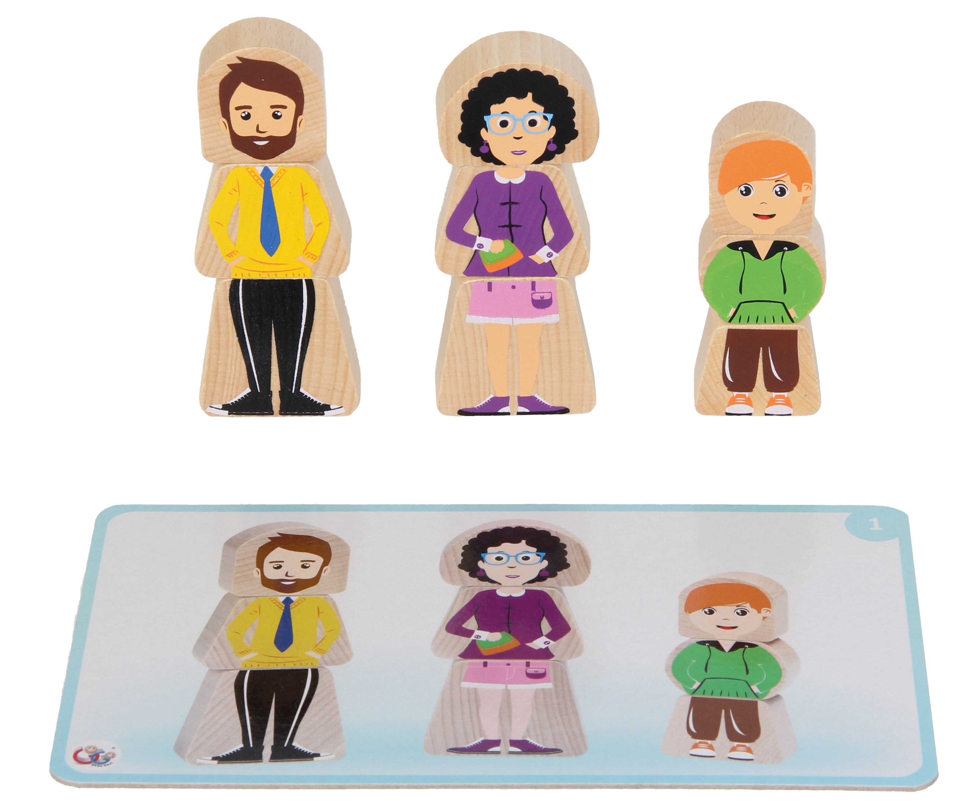 Kreativ und lehrreich! Beim Zusammenstellen der Outfits für die Familienmitglieder werden spielerisch praktische Fähigkeiten trainiert. Ein tolles frühkindliches Spielzeug, das viele Stunden Freude macht und auf fantasievolle und kreative Weise die Feinmotorik und die Hand-Auge-Koordination fördert. Kleide die Familienmitglieder gemäß den Vorlagekarten oder kreiere Deinen eigenen Stil! Vorlagekarten 23 x 13cm Figuren groß 12cm, klein 9cm