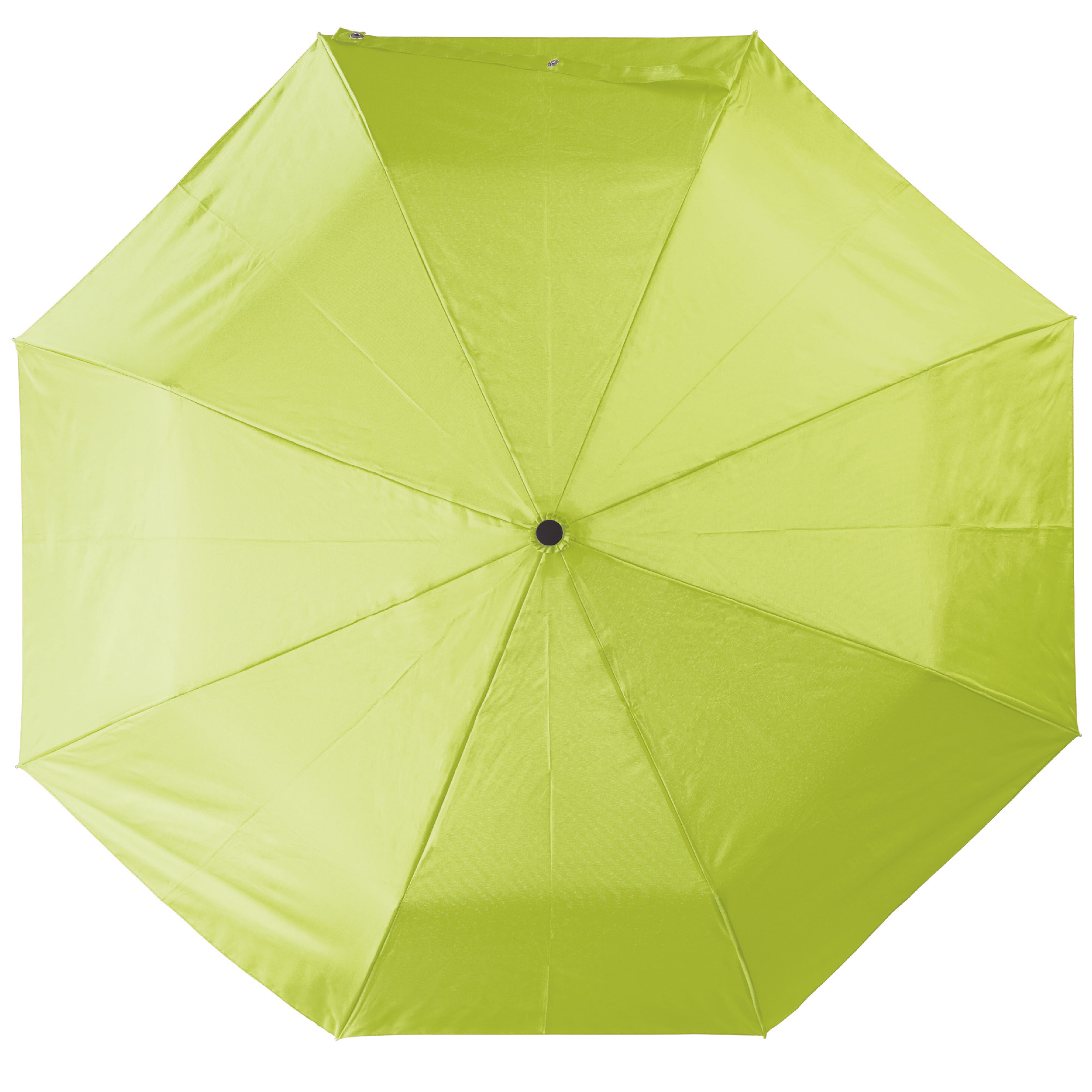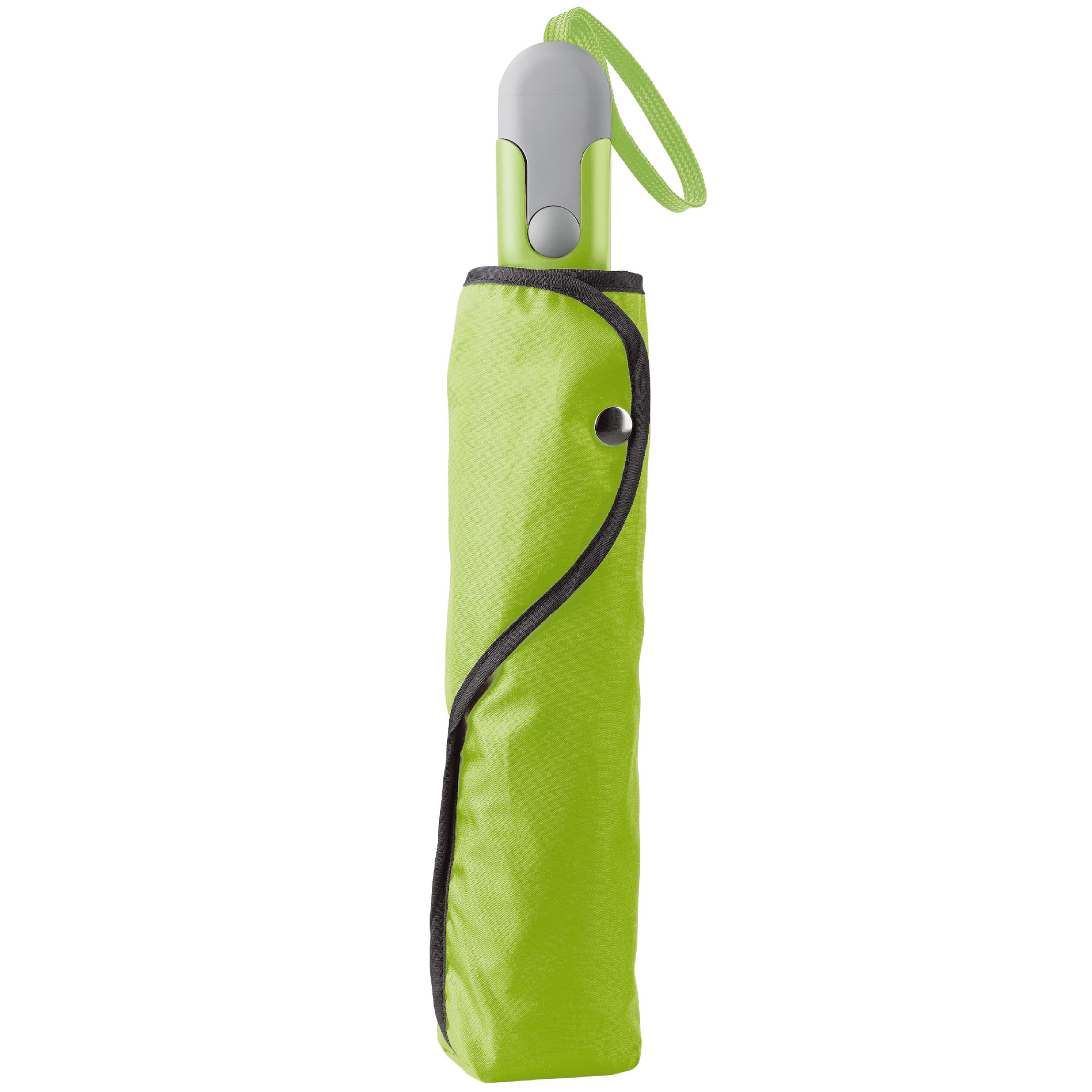 Schöner faltbarer Regenschirm mit Hülle und ergonomischem Designgriff. Die Verstrebungen des Gestells sind aus Fiberglas für zusätzliche Haltbarkeit. Das schwarze Gestell bildet einen schönen Kontrast zum bunten Schirmdach aus Pongee-Polyester.