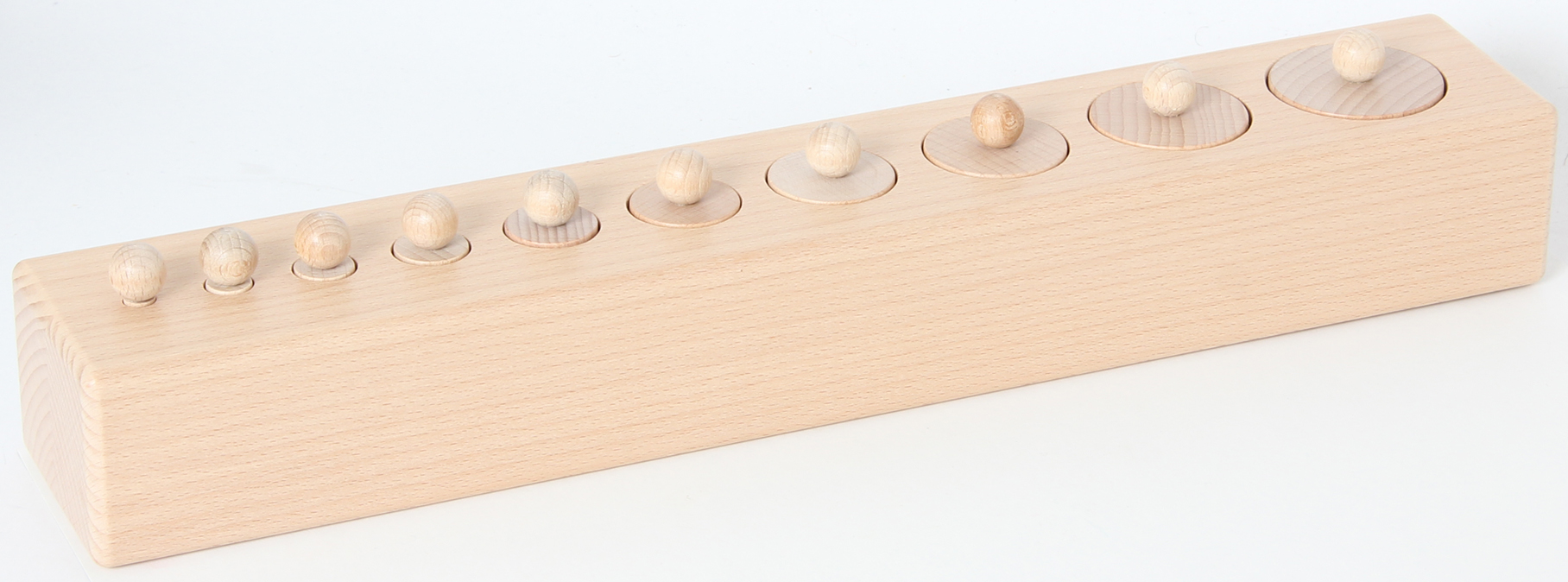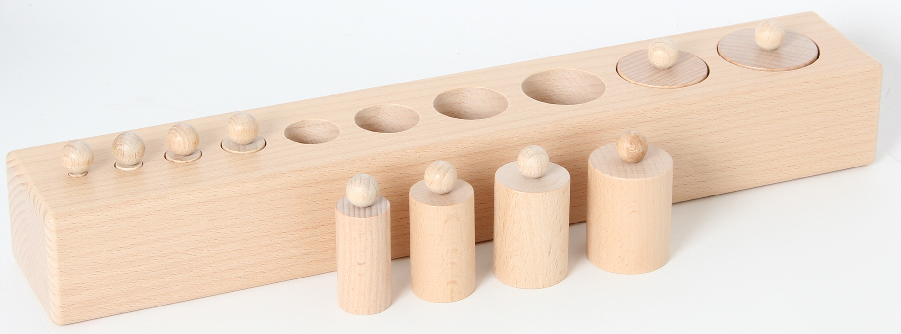10 Holzzylinder in gleicher Höhe mit verschiedenem Durchmesser - Veränderung in zwei Dimensionen. Bezeichnung: dick und dünn. Mit den hölzernen Einsatzzylindern lernt man verschiedene Dimensionen visuell zuzuordnen und zu unterscheiden. Durch das Fassen der Zylinderköpfe werden die Schreibfinger trainiert. Das Material ist eine gute Vorbereitung auf die Mathematik. Der Wortschatz wird bereichert: groß - klein, kleiner, am kleinsten ... Selbstkontrolle durch Material. Länge des Holzblocks: 38 cm. Ab 3 Jahren.