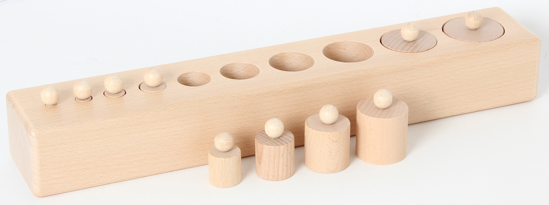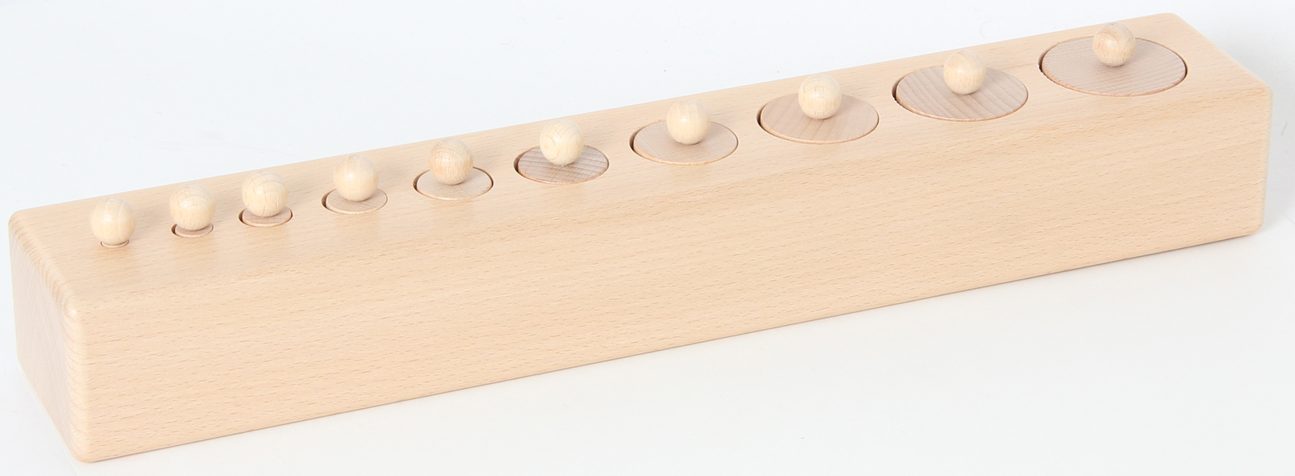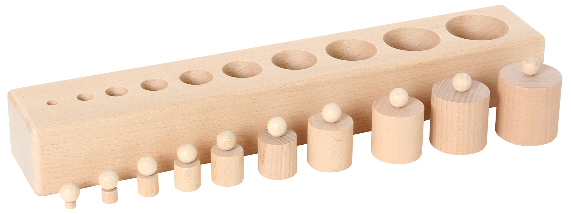 10 Holzzylinder, die in Durchmesser und Höhe synchron abnehmen - Veränderung in drei Dimensionen. Bezeichnung: groß und klein. Mit den hölzernen Einsatzzylindern lernt man verschiedene Dimensionen visuell zuzuordnen und zu unterscheiden. Durch das Fassen der Zylinderköpfe werden die Schreibfinger trainiert. Das Material ist eine gute Vorbereitung auf die Mathematik. Der Wortschatz wird bereichert: groß - klein, kleiner, am kleinsten ... Selbstkontrolle durch Material. Länge des Holzblocks: 38 cm. Ab 3 Jahren.