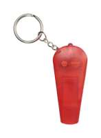 Transparente Pfeife aus Kunststoff mit Metall-Schlüsselring und weißem LED-Licht. Inkl. Knopfzellenbatterie.