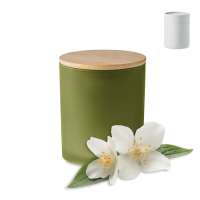 Duftkerze aus pflanzlichem Wachs in einem Milchglashalter mit Bambusdeckel. Mit 120 Gramm Wachs. In Kraftpapierbox.