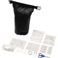 Notfallset mit 14 Zubehörteilen in einem strapazierfähigen 600D-Polyesteretui mit Reißverschluss, Fronttasche und Metallkarabiner. Enthält Verbände, Tücher, alkoholhaltige Tücher und Juckreizlindernde Tücher.