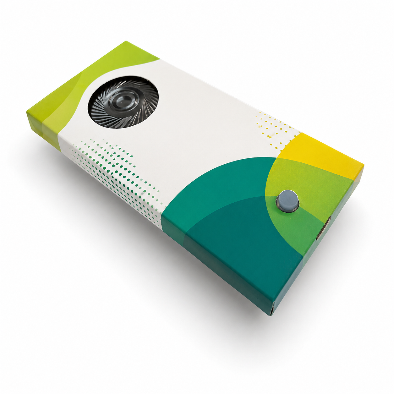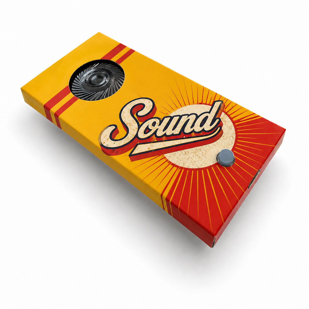 Soundmodul eingebaut in einem bedruckten Karton. Karton weiss, matt. Der Sound wird durch Druck auf einen Taster ausgelöst. Kartongröße ca. 100 x 48 x 10 mm. Inklusive runder Karton-Ausstanzung für den Lautsprecher. In dem Karton sind die Platine mit Elektronik, die Knopfzellen und der Lautsprecher in einem Foaminlay eingebaut. Auf der Rückseite der Kartonbox kann ein Doppelklebeband-Pad angebracht werden, damit sie die Soundmodulbox einfach in ihren Verpackungs- oder Geschenkkarton einkleben können.