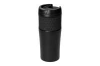 Kleiner Isolierbecher mit grauer Manschette aus Silikon. Becher ist vakuum-isoliert und hält somit die Temperatur der Getränke länger konstant. Mit einem Schraubdeckel aus PP und einer verschließbaren Trinköffnung. Füllmenge: ca. 0,3 Liter.