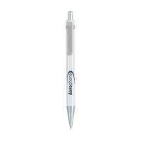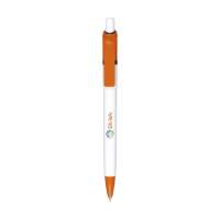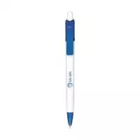 Blauschreibender oder schwarzschreibender Kugelschreiber mit weißem Gehäuse, farbigem, grifffestem Vorderstück und Metallclip.