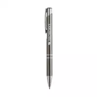 Blauschreibender oder schwarzschreibender Kugelschreiber aus Aluminium mit mattfarbenem Gehäuse in Metalloptik und metallenem Clip / Druckknopf.