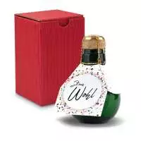 Eine Kleinere gibt es nicht: 0,125 l hochwertiger Sekt brut in origineller Flasche mit Naturkork und Agraffe, Alkohol 12% Vol., inklusive 0,17 € Schaumweinsteuer in Deutschland! Präsentiert in origineller Schmuckwelle - in 4 Farben...